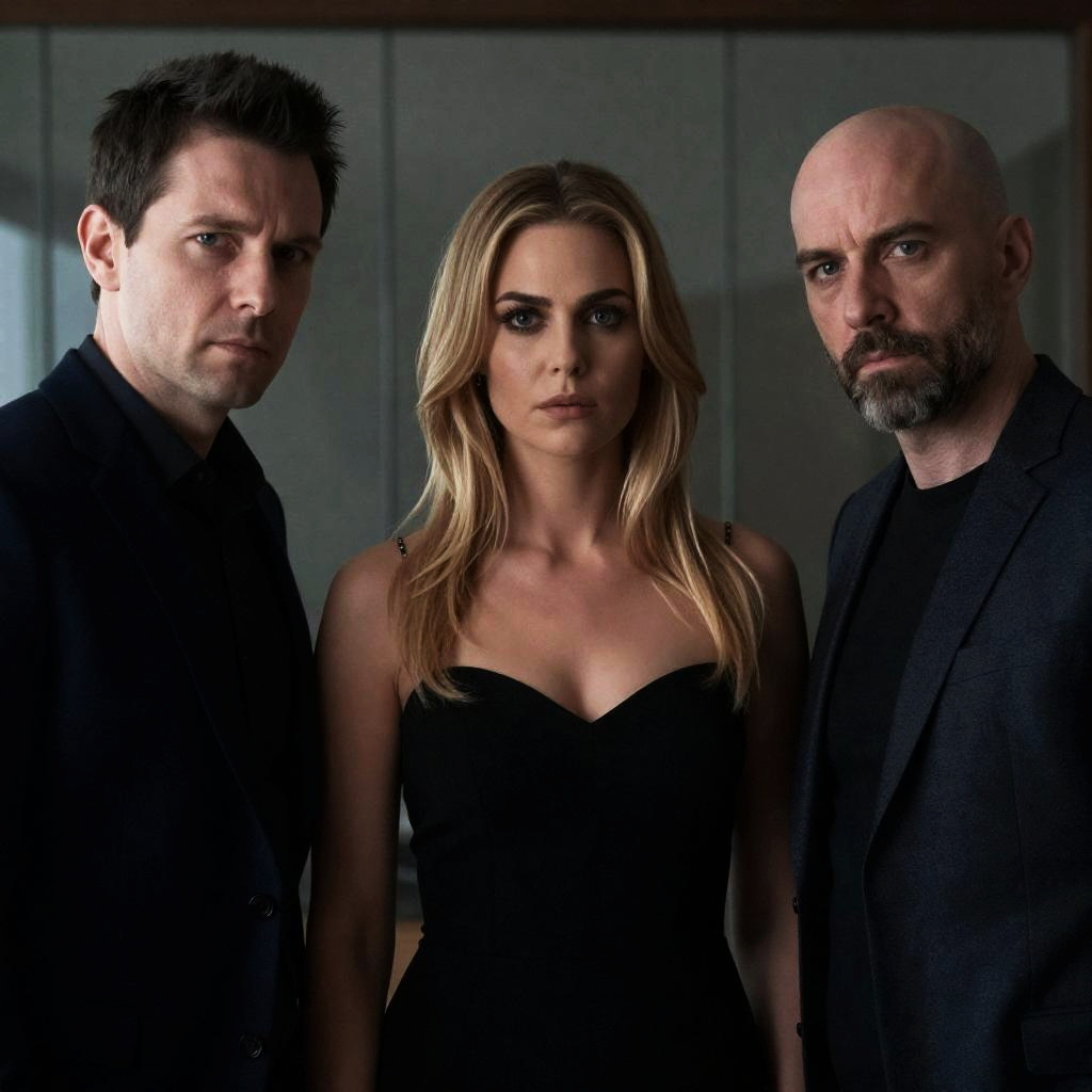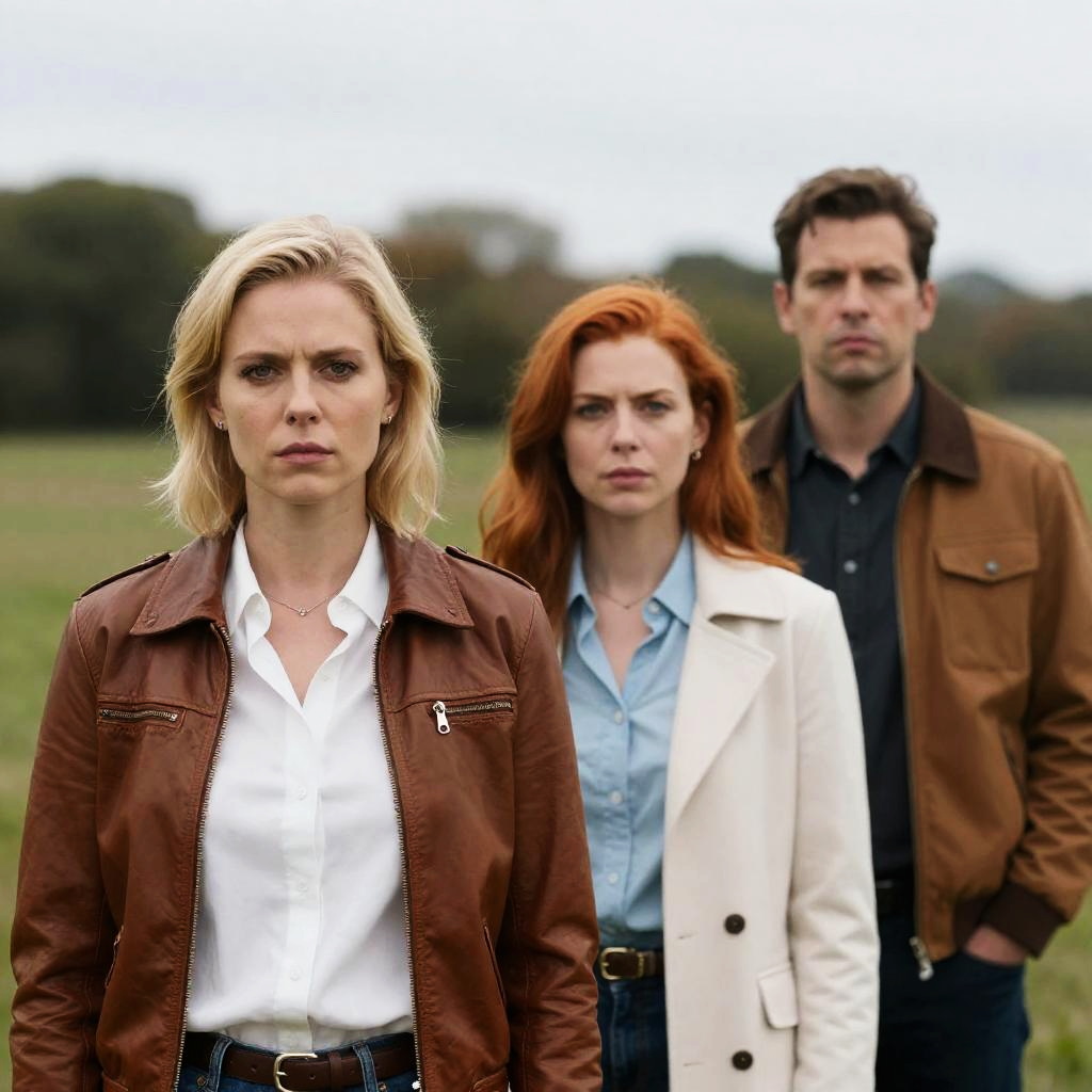 Photograph of three people standing together indoors. A man with dark hair in a green corduroy jacket and white shirt on the right, a woman with red hair and black lace dress in the center, and a blonde woman in a blue dress on the left. All three look slightly upward with serious expressions. Background includes a ured wall and a wooden cabinet.
