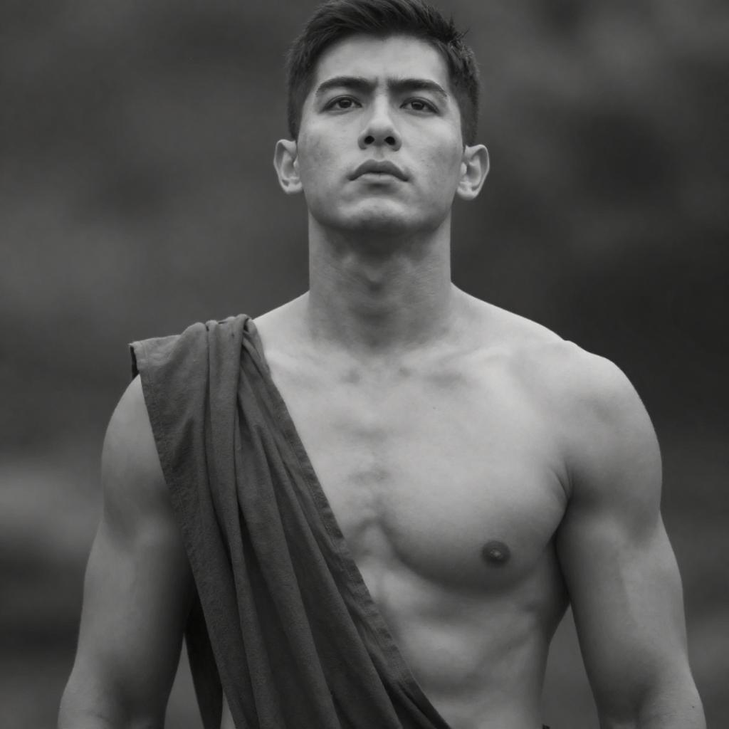 Photograph of a muscular, shirtless man with short dark hair and tanned skin, standing against a rugged, dark volcanic rock background. His glistening skin suggests sweat, and he looks intently to the side. The rocks have a rough, ured appearance, contrasting with his smooth skin.