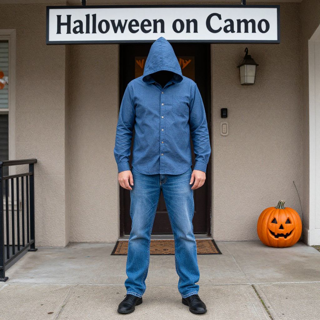 Man wearing blue jeans and a blue shirt with a hoodie over his head. He is standing on a sidewalk in front of a building with a sign that reads 'Halloween on Camo'.