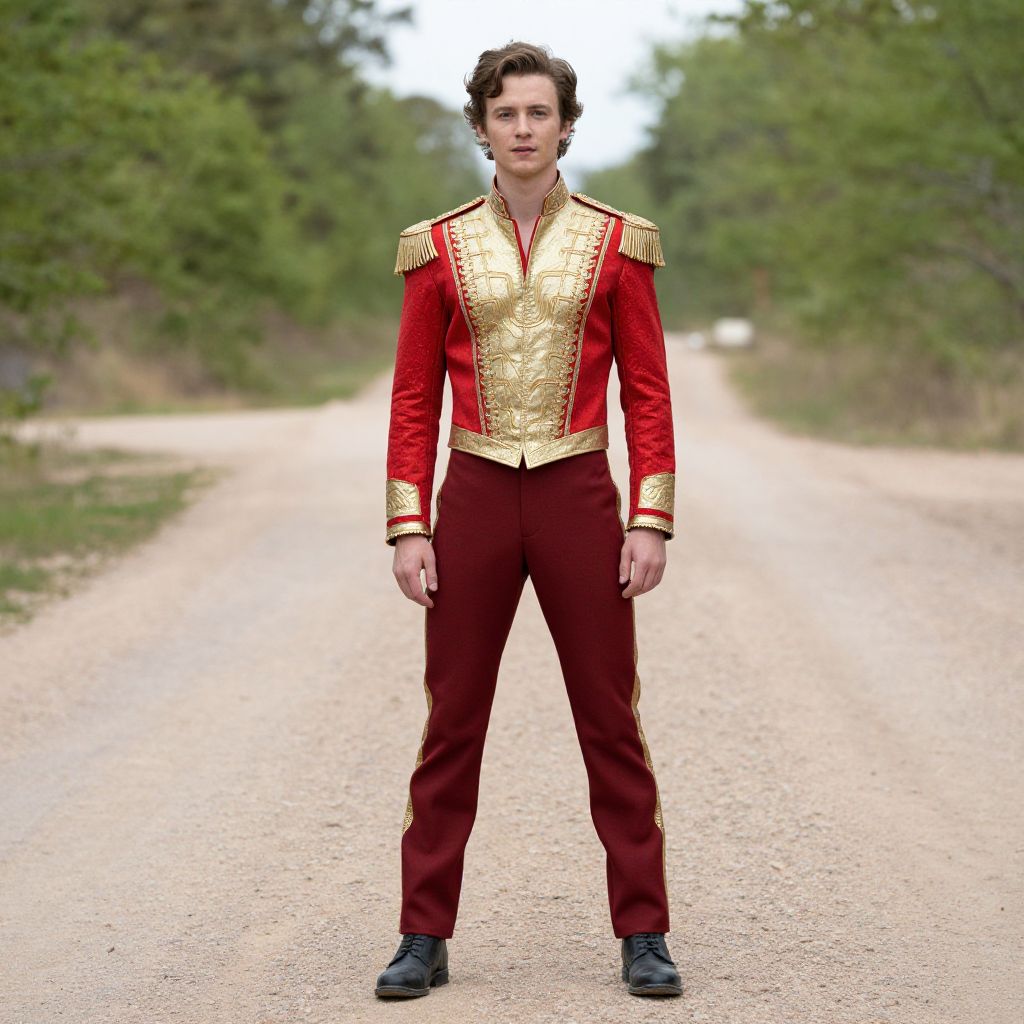 Photograph of a young Caucasian man standing on a gravel path in a forest. He has short, curly brown hair and a neutral expression. He is wearing a vibrant red jacket with gold epaulettes and intricate gold patterns on the chest and sleeves, paired with matching red pants with gold stripes. His black shoes contrast with the bright clothing. The background is a blurred, tree-lined path with green foliage on either side, creating a natural, serene setting. The overall style is regal and formal, with a slightly vintage or theatrical feel.