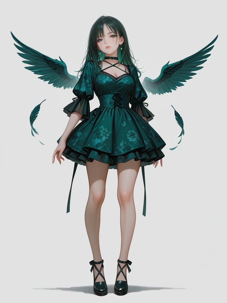 1girl, realistic face, full body shot, Woman, bohemian, sheer dark green mini dress with a floral pattern, V-neckline, short flutter sleeves, empire waist, layered skirt, simple black choker, white background.