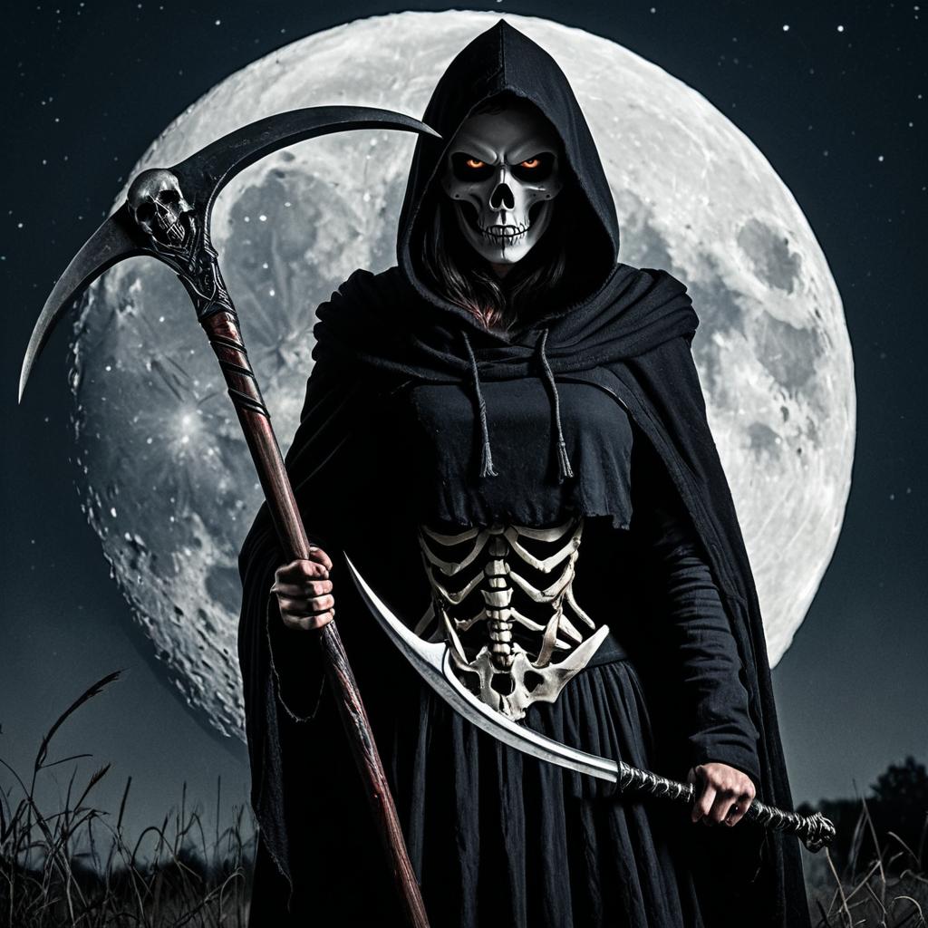 Masterpiece, best quality, 1girl, death, reaper, scythe, red eyes, holding, black hood, skull, stomach, expressionless, moon