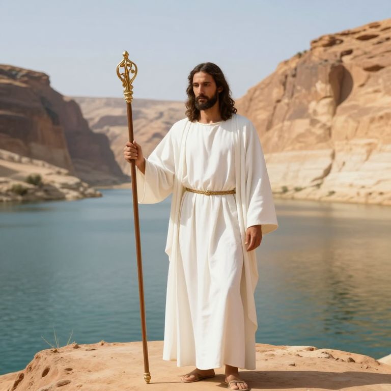 This striking image features a figure resembling Jesus, adorned in a flowing white robe and wielding a staff, standing by a serene body of water surrounded by desert cliffs. The scene captures a peaceful moment of reflection and spirituality, evoking themes of faith and leadership in a picturesque natural setting.