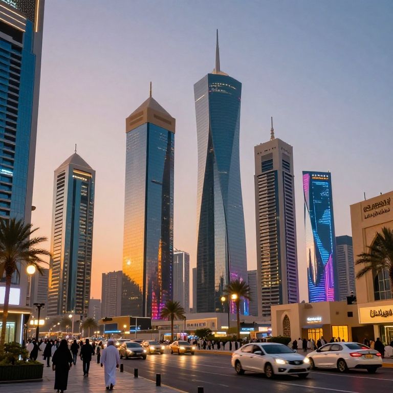 Ksa futuristic cityscape at sunset, showcasing towering skyscrapers with Arabic architectural elements, bustling streets filled with modern vehicles and pedestrians in traditional dress, vibrant neon lights reflecting off glass facades, digital art style