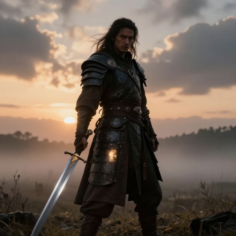 Warrior with long hair standing on a misty battlefield at dawn, clad in rugged armor, wielding a glowing sword, intense expression, cinematic lighting, dramatic clouds in the sky, detailed environment