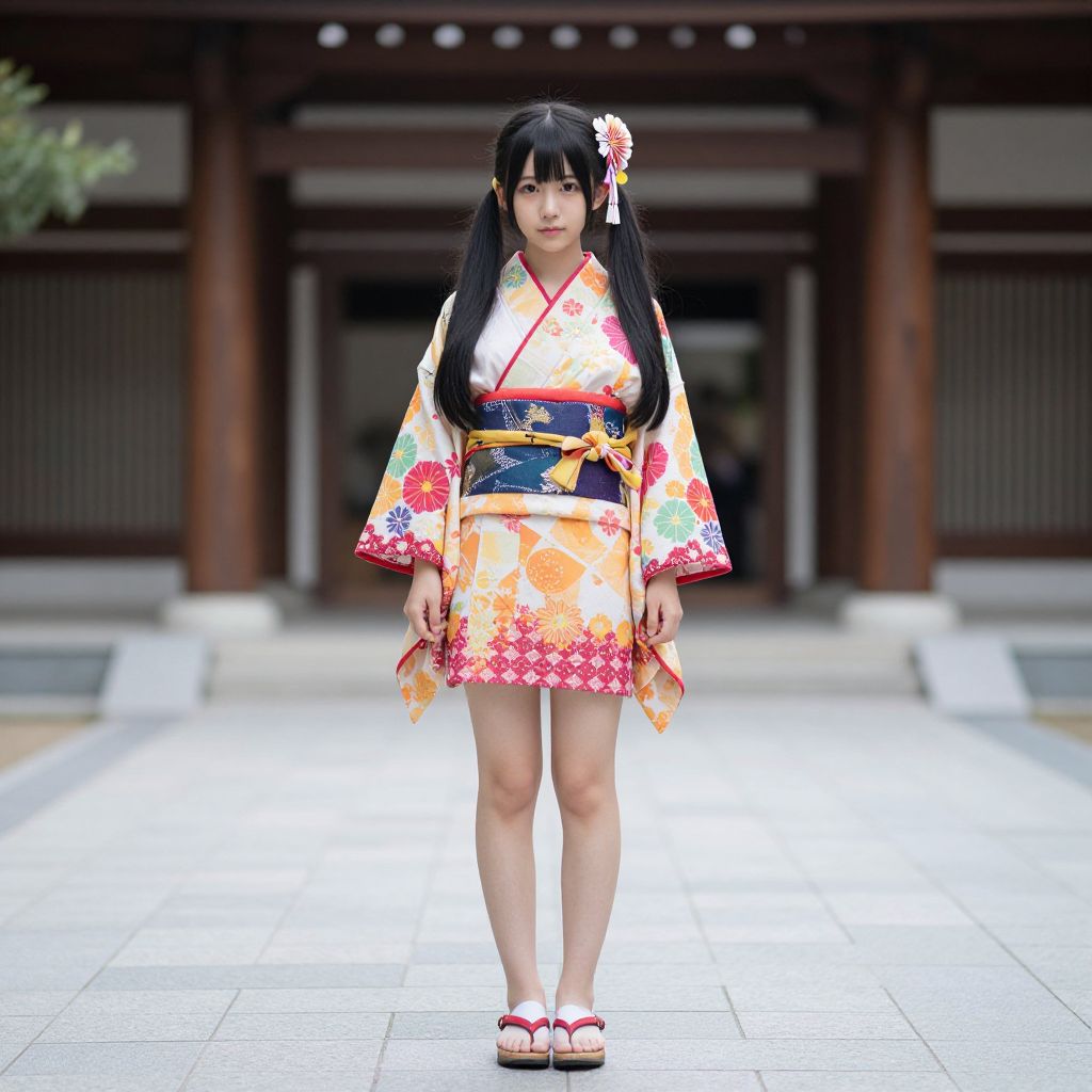 Mineta costume, 1girl, solo, twintails, black hair, outdoors, hair ornament, flower, looking at viewer, japanese clothes, hair flower, day, sandals, standing, long hair, black eyes, full body, blurry, east asian architecture, architecture, sleeves past wrists