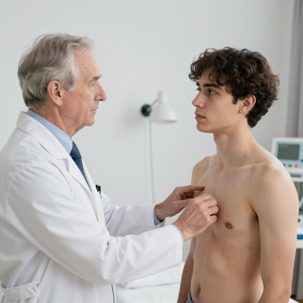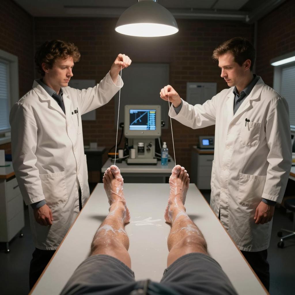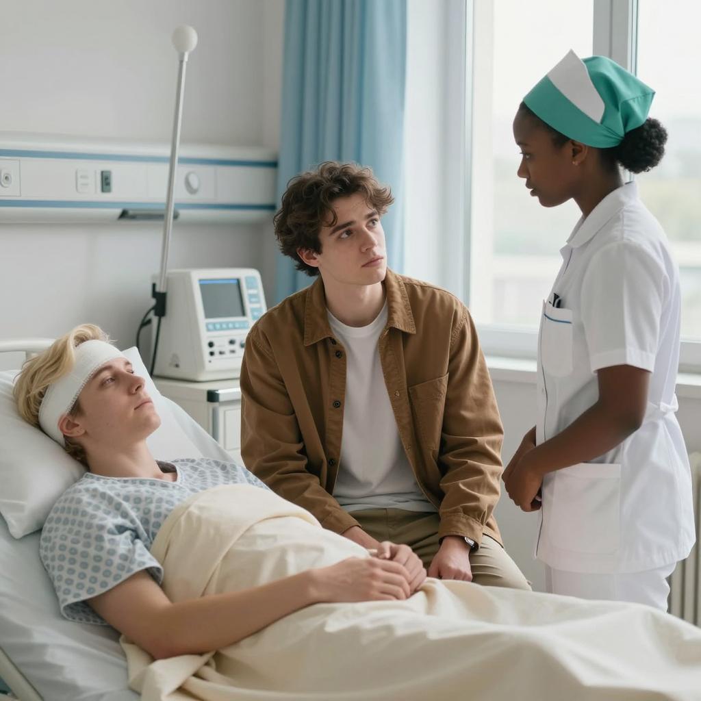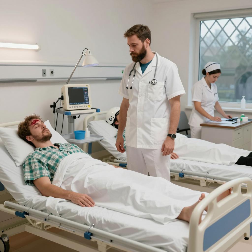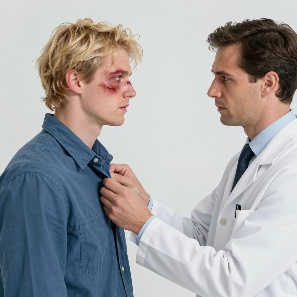 Two men in a clinical setting. The man on the left has blonde hair, a wounded face, and wears a blue shirt. The man on the right has dark hair, wears a white lab coat, and looks at the blonde man with a serious expression. He holds the blue shirt's collar. The background is plain and white.