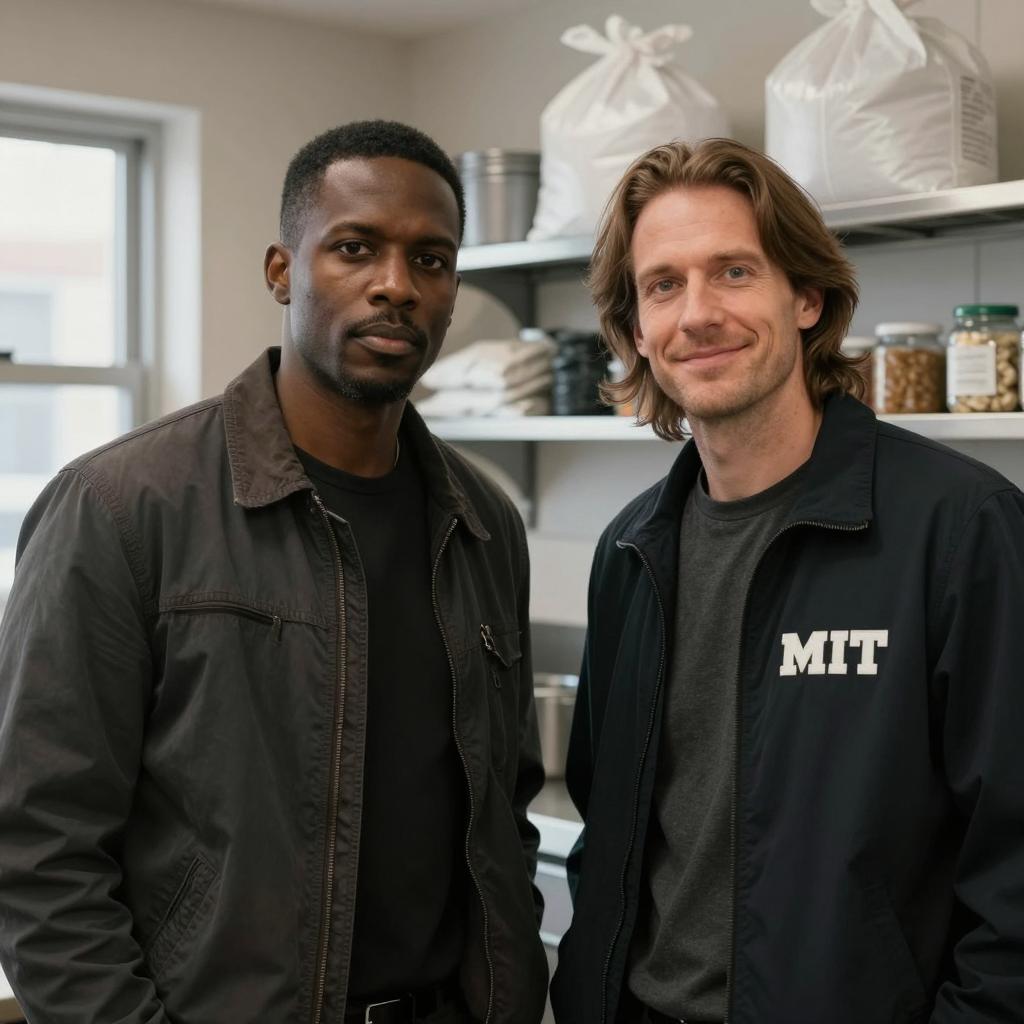 Three men standing close together. Left: black man with short afro, leather jacket, serious expression. Center: white man with brown hair, goatee, white t-shirt, brown cardigan, smiling. Right: white man with brown beard, teal cap, navy jacket, graphic t-shirt, looking to the right. Background: plain, light-colored walls, door.