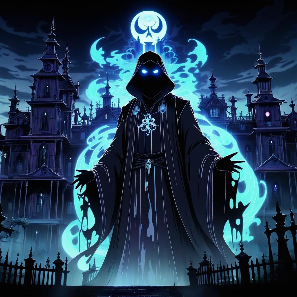 A ghastly specter, with tattered robes and glowing eyes, looming over a haunted mansion, drawn in the visceral and unsettling anime style of Hajime Isayama.