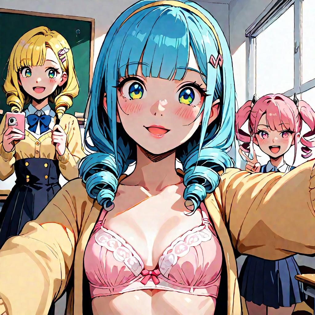 Score_9, rating_questionable, 3girls, classroom, picture frame, window shade, sunbeam, blush, dark dusk, hoshizora miyuki, pink hair, twin drills, pink eyes, (pink bra), topless, smile, selfie, small breasts, open mouth kise yayoi, yellow hair, yellow eyes, white hairband, hair ornament, medium hair, yellow cardigan, (open clothes), (yellow bra:1.2), tears, looking down aoki reika, straight long blue hair, hairpin, blunt bangs, blue eyes, (v), white bra, expressionless, light smile