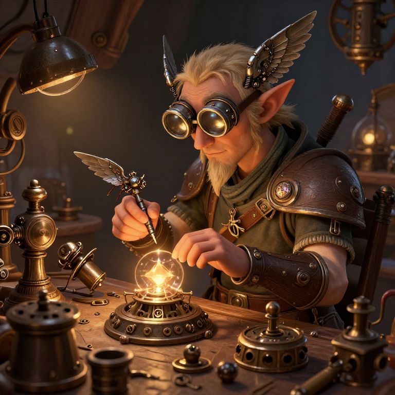 Dnd autognome art, a whimsical steampunk-style autognome with intricate brass gears and glowing eyes, standing in a fantasy workshop filled with magical alchemical tools, detailed fantasy illustration, vibrant colors, dramatic lighting