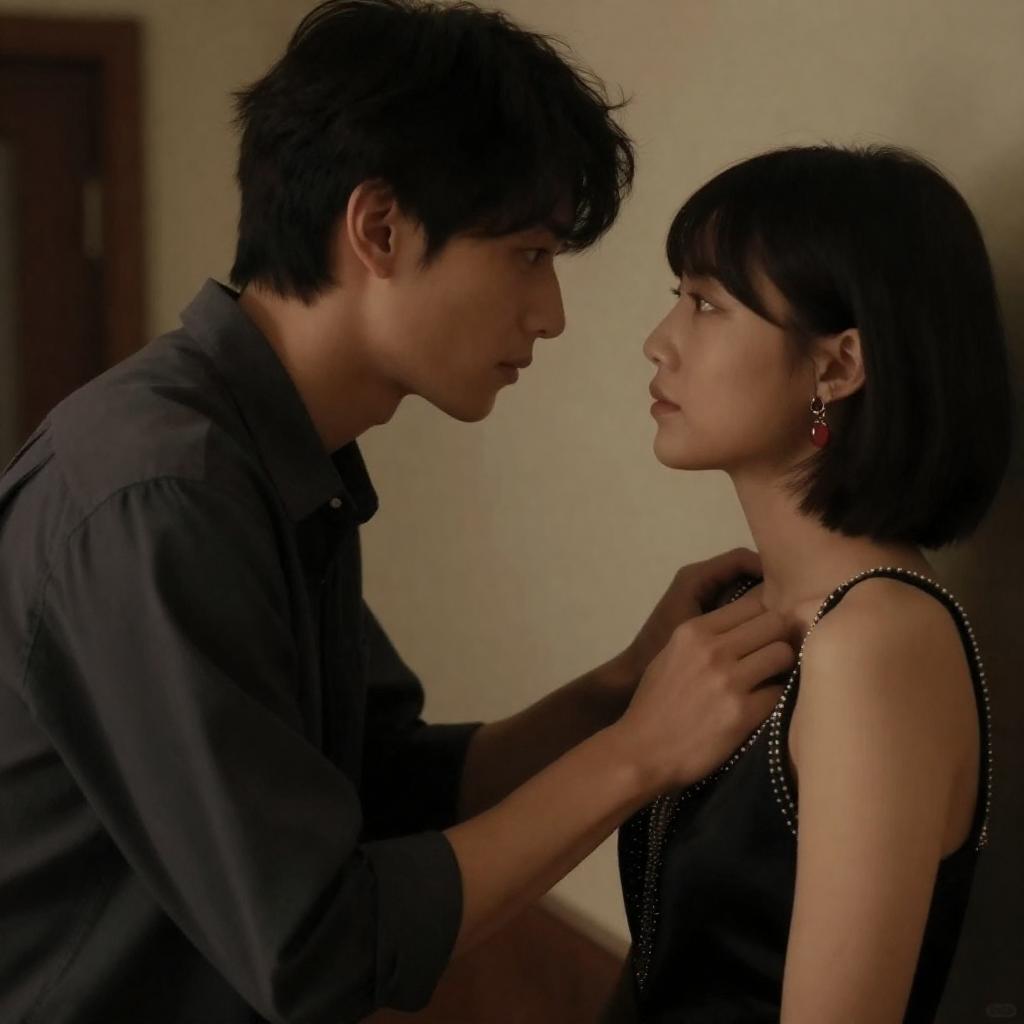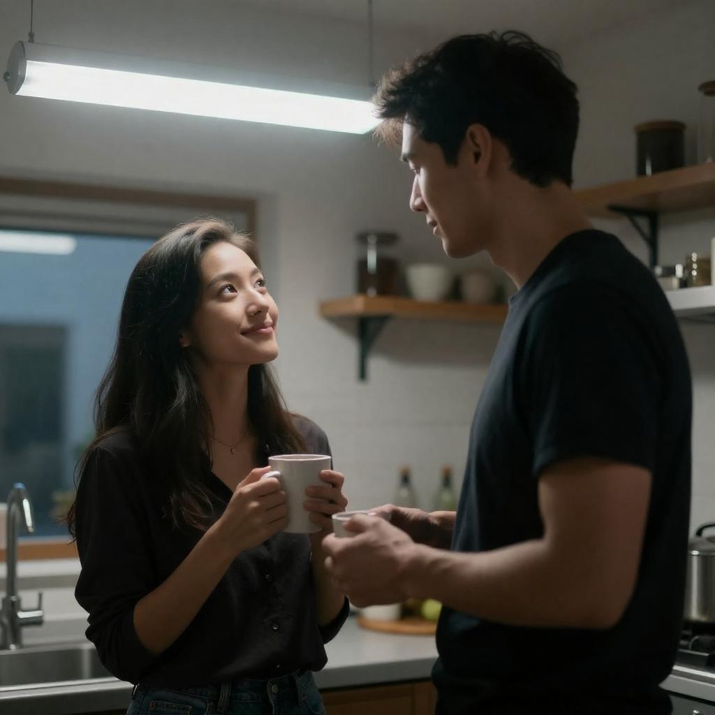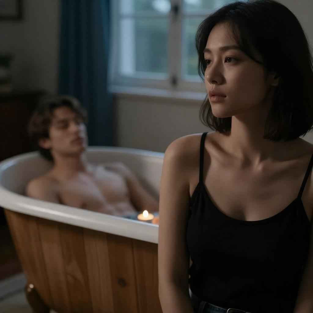 Photograph of a dimly lit room with a woman in a black tank top in the foreground, looking to the right. In the background, a shirtless man with short brown hair reclines in a wooden bathtub, eyes closed, illuminated by a small candle. Blue curtains and a window are visible behind the man.