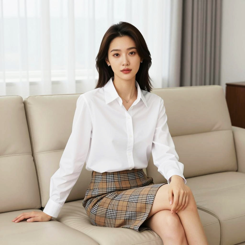 This enchanting image features a woman in a stylish plaid top paired with a classic skirt, seated at a table adorned with delicate tea cups in a lush garden setting. The vibrant greenery and blooming flowers create a serene atmosphere, making it a perfect representation of elegance and tranquility in nature.