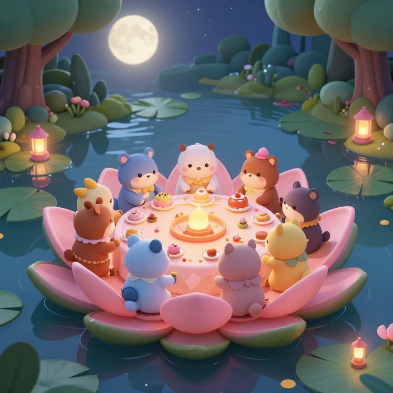 A captivating digital artwork portraying an idyllic gathering on an expansive, buoyant water lily in a tranquil pond at twilight. From an overhead view, we observe a collection of charming woodland creatures gathered around a table festooned with soft pastel tones and luminous lanterns. The scene evokes a delightful fusion of wonder, mirth, and serenity as the animals engage in animated discourse and savor delectable confections under the gentle, silvery light of the moon filtering through the treetops above.