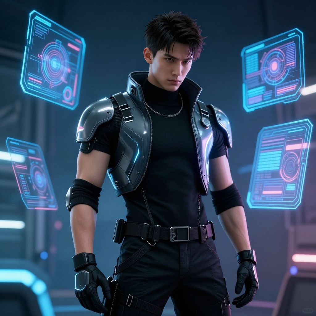 Photorealistic CGI of a muscular, young Asian man with short, dark hair, standing in a futuristic, blue-lit room. He wears a black, sleeveless, leather jacket with shiny, metallic shoulder armor, a black turtleneck, black pants, and black gloves. Floating around him are four glowing, holographic screens with circular patterns. The background is blurred, featuring indistinct, metallic structures. His serious expression and confident stance suggest readiness and determination. The lighting highlights the sheen of his armor and the texture of his leather jacket.