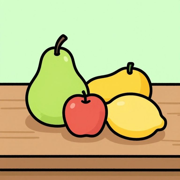 Digital drawing of a green pear, red apple, and two yellow peaches on a wooden table with a white background.