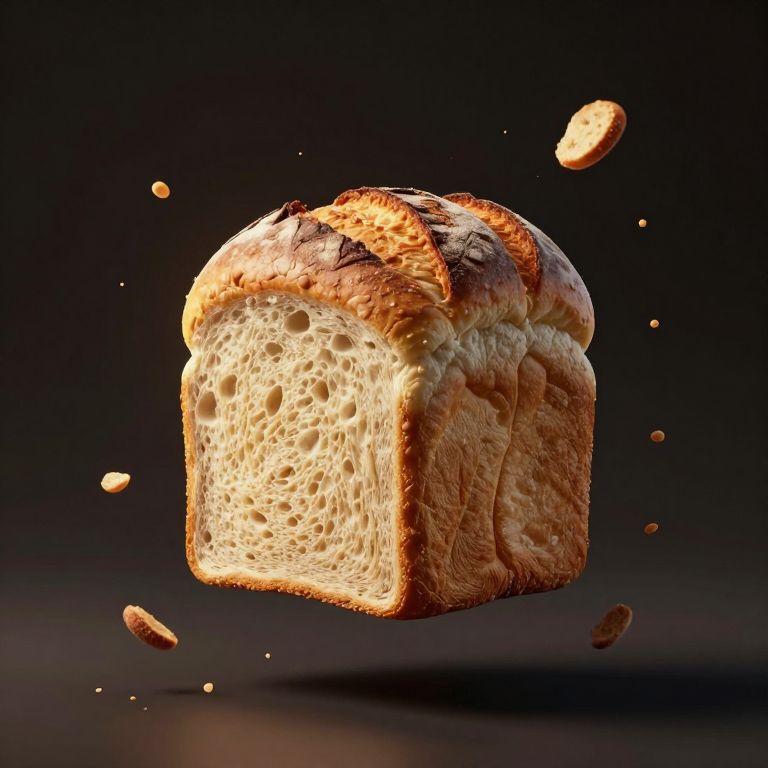 Photorealistic CGI of golden-brown, crusty bread loaf mid-air, with crumbs floating around, set against a dark, gradient background.