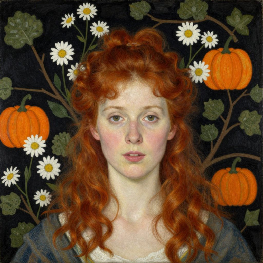 Portrait of a woman with vibrant red hair styled in loose curls, set against a dark background adorned with intricate floral branches featuring white daisies, orange pumpkins, and green leaves, evoking a rustic charm reminiscent of Elise by Stanley Spencer (1891-1959, United Kingdom).