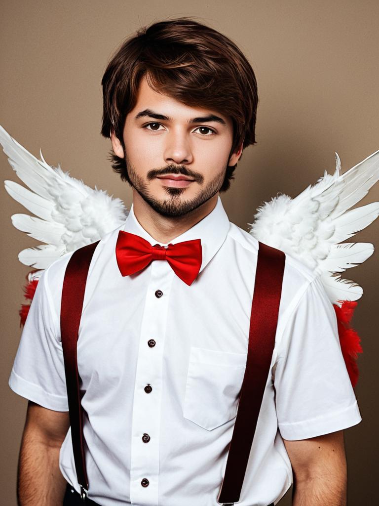 Man cupid costume, 1boy, male focus, solo, wings, angel wings, shirt, bow, suspenders, white shirt, realistic, red bow, looking at viewer, bowtie, upper body, brown hair, feathered wings, angel, red bowtie, facial hair, short hair, white wings