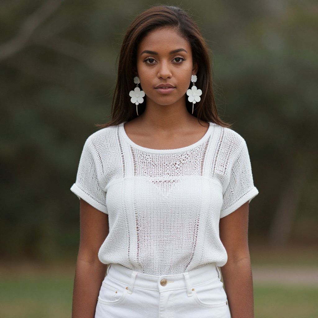 Photograph of a young Black woman with dark brown skin and straight, shoulder-length black hair. She wears a white, short-sleeved, knitted lace top with a round neckline and high-waisted white pants with a single button. Her large, white, floral-shaped earrings stand out against her hair. She stands against a blurred green and brown outdoor background, looking directly at the camera with a neutral expression. The overall style is casual and natural, with a focus on the simplicity and elegance of her white outfit.
