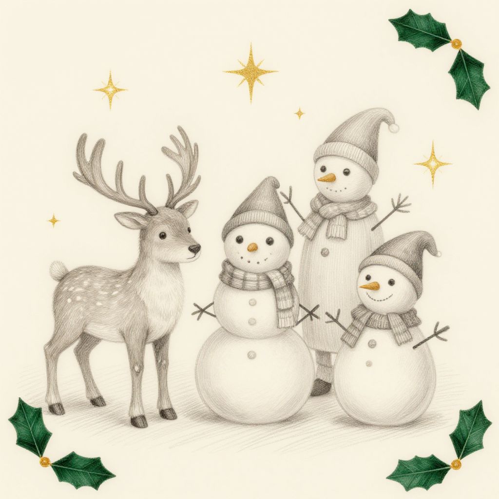 Christmas drawing aesthetic featuring whimsical holiday characters like reindeer, snowmen, and elves, sketched with fine pencil strokes, muted color palette of cream, gold, and emerald, surrounded by twinkling stars and holly leaves, evoking nostalgic festive spirit
