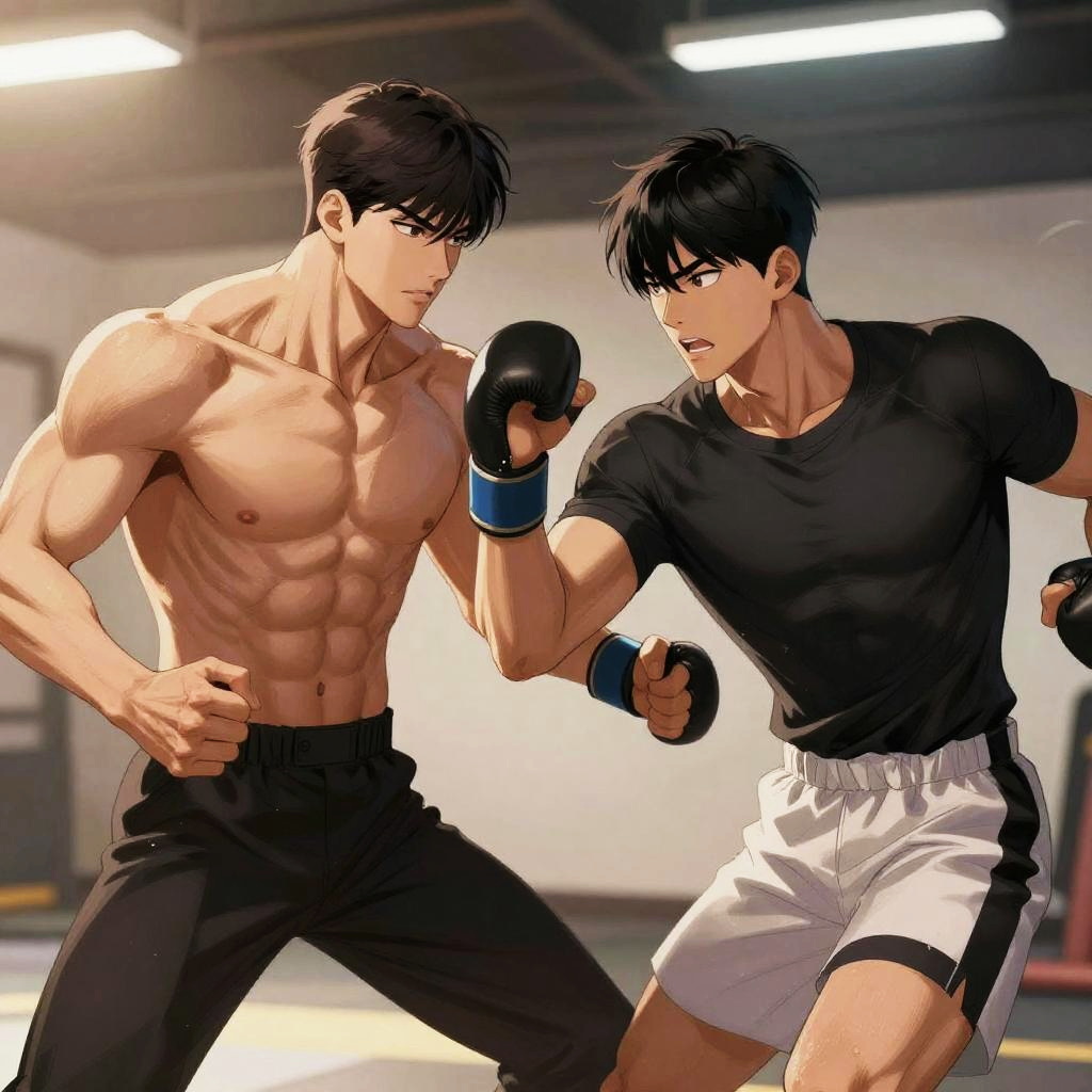 Dramatic fight scene rendered with AI webtoon Lookism filter, capturing dynamic movement, sharp contrasts, and bold character expressions in a style reminiscent of popular Korean webtoons, blending realistic anatomy with comic exaggeration.