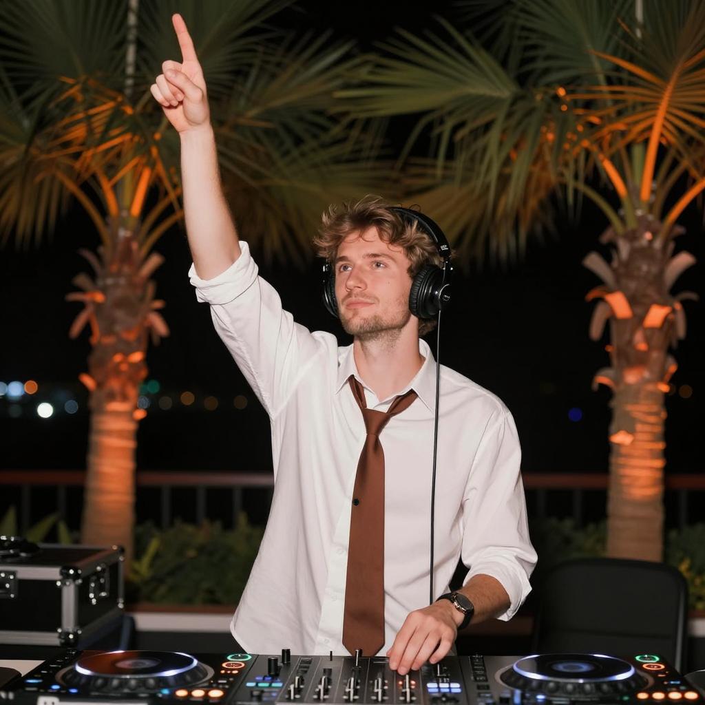 Male DJ with light brown hair, wearing a white dress shirt, loose brown tie, and black headphones, stands behind a DJ mixer. He raises his right arm, pointing upwards. Palm trees with illuminated orange backlighting fill the background. Left side: DJ equipment. Right side: empty chair. Bright lighting highlights his face and upper body.