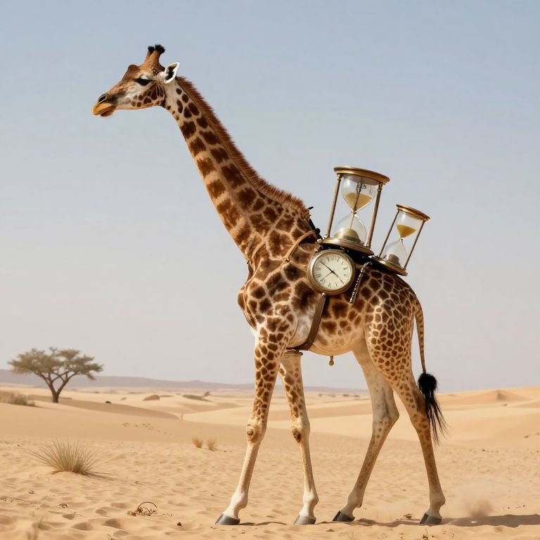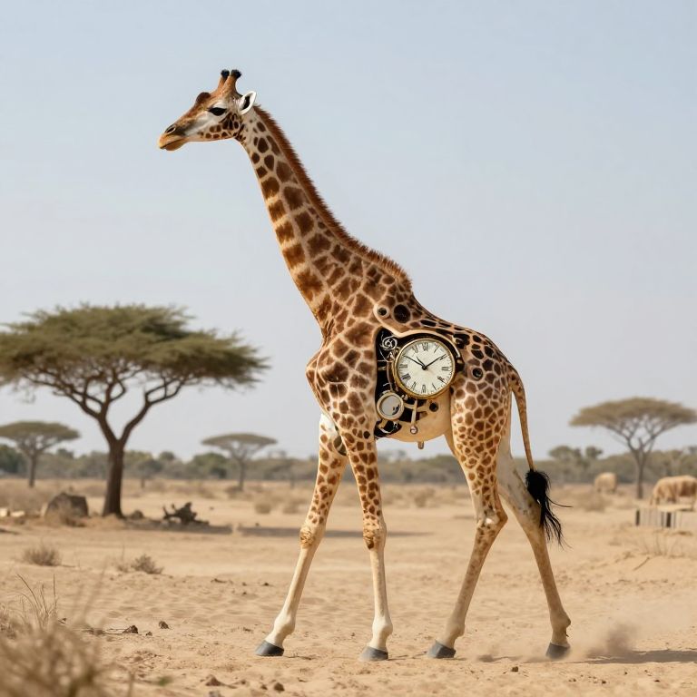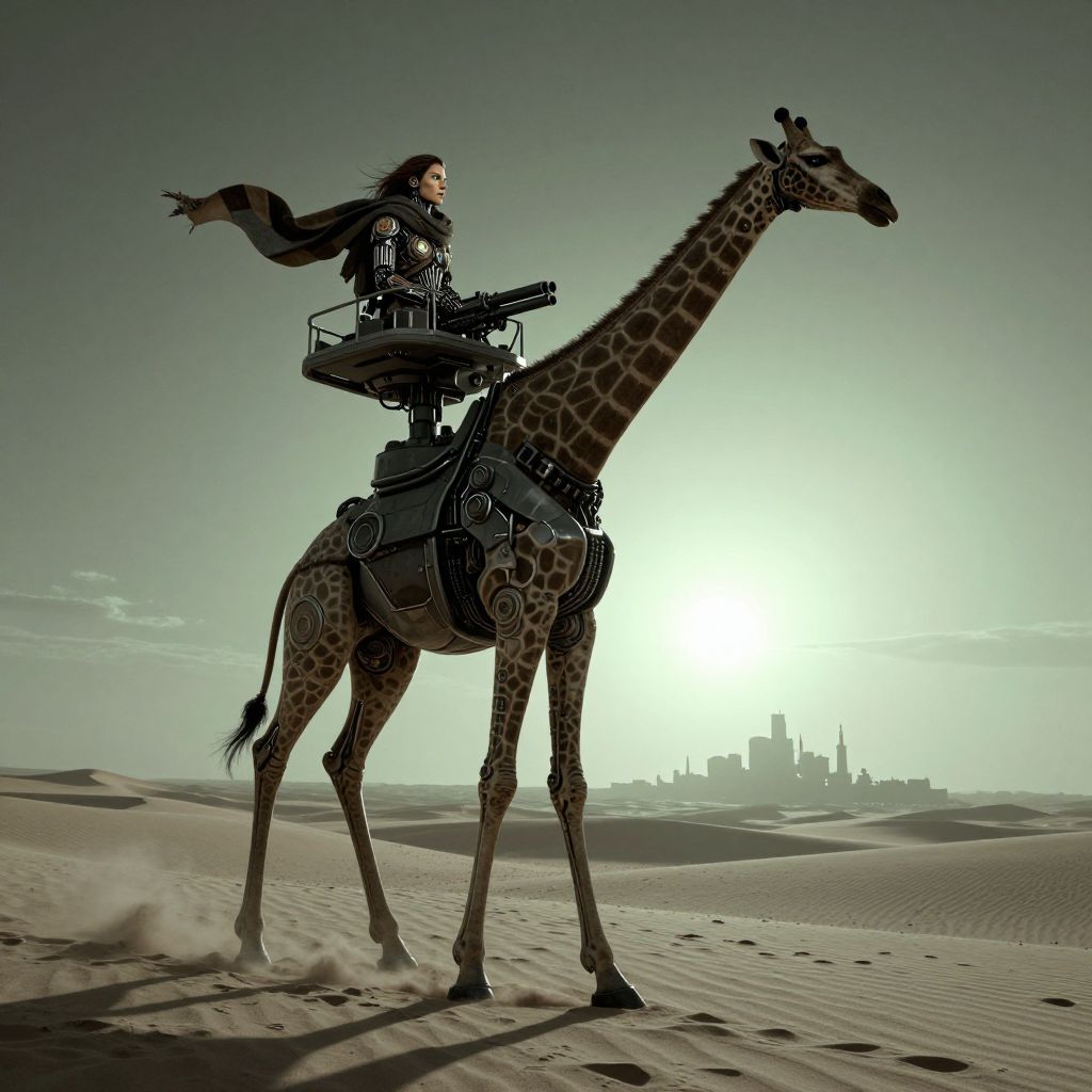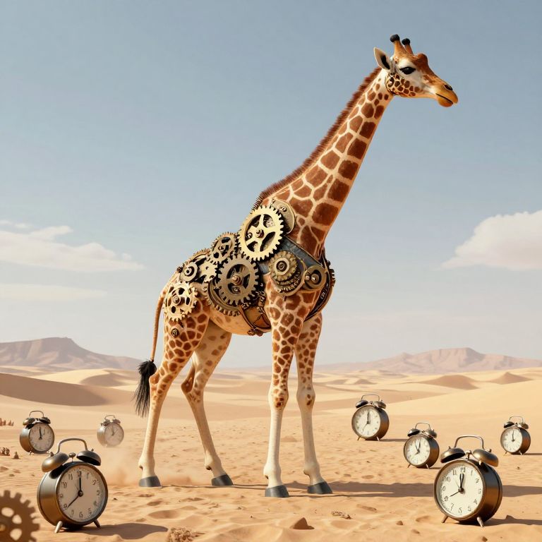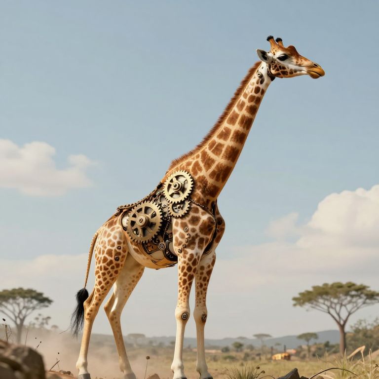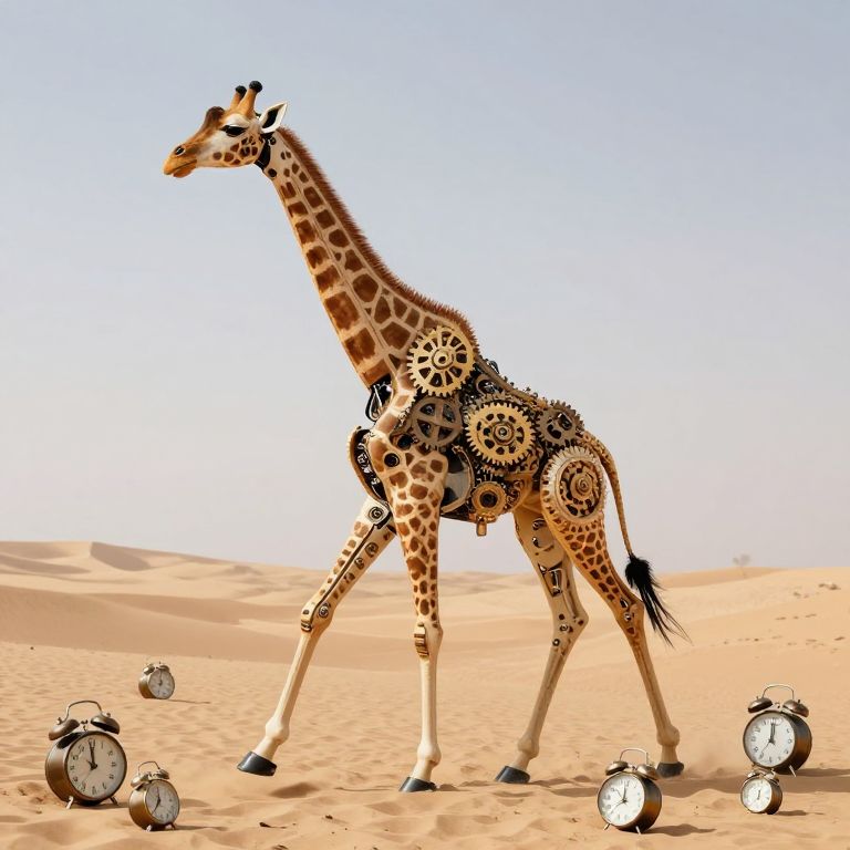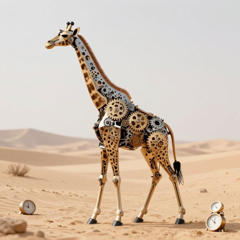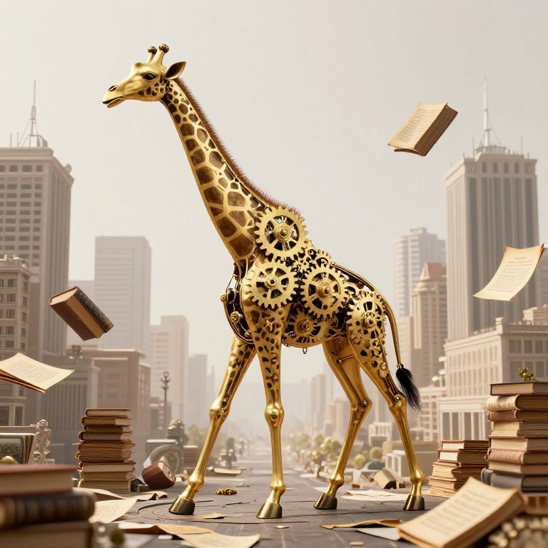 In a surreal, cyberpunk-inspired 3D-rendered scene, a colossal brass clockwork giraffe strides gracefully through a fantastical cityscape where floating books and cascading equations blend seamlessly into the air, creating a mesmerizing interplay of mechanical precision and ethereal beauty under golden-hour lighting.