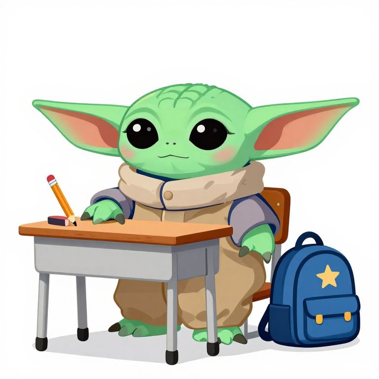 In this captivating 2D illustration, Baby Yoda, the beloved character from the Star Wars universe, is depicted in a charming and endearing manner. Seated at a classroom desk, he is dressed in a navy blue polo shirt and khaki uniform pants, exuding a sense of studiousness and readiness for learning. The desk, a simple wooden structure, is adorned with a pencil and an eraser, hinting at the academic setting. To the right of the desk, a blue backpack with a star design rests, possibly containing more learning materials. The background is a stark white, which accentuates the vibrant colors of Baby Yoda's green skin and the clothing. The overall composition is balanced, with Baby Yoda centrally positioned, creating a focal point that draws the viewer's attention. The illustration is rendered in a manga style, characterized by its flat colors and clean lines, giving it a modern and artistic flair. The spatial relationships are well-defined, with Baby Yoda sitting comfortably at the desk, the pencil and eraser neatly arranged, and the backpack placed to the side, all contributing to a sense of order and tranquility.