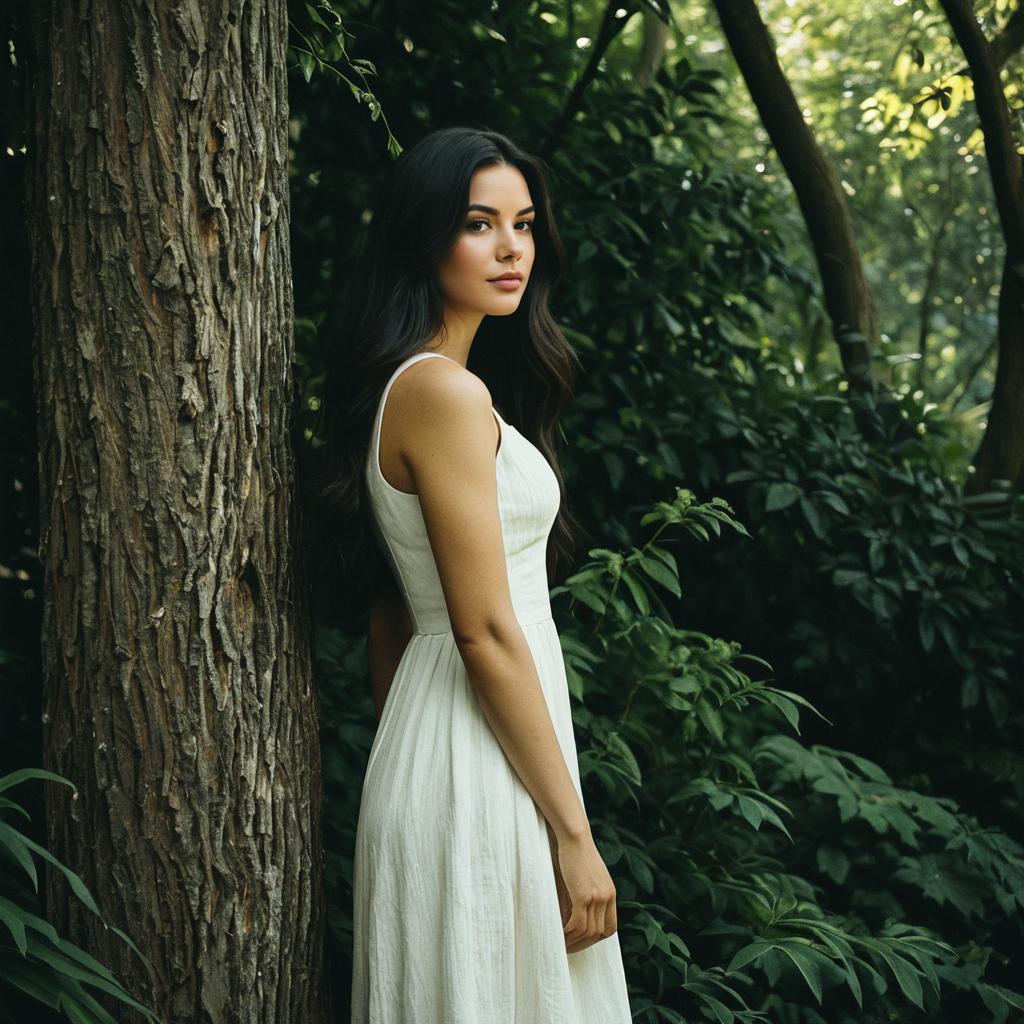 A young woman with long black hair wearing a floral dress sits on stone steps outside a rustic coffee shop during golden hour. The soft pastel sunlight enhances the serene atmosphere with rolling hills and flowers in the background, creating a warm and picturesque outdoor setting.