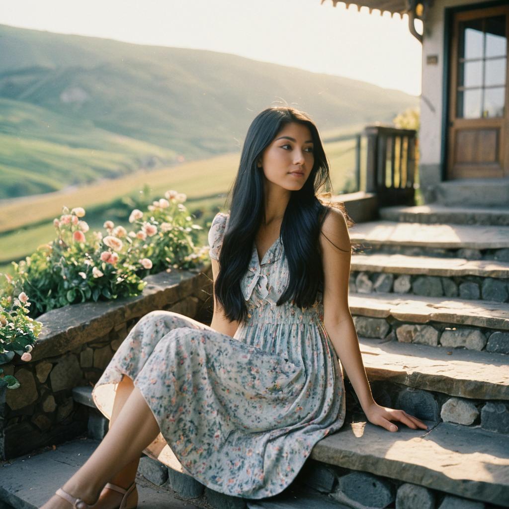 A young woman with long black hair in a flowing floral dress perches on the stone steps of a quaint coffee shop at golden hour, cinematic 35mm film look, ethereal pastel sunlight, shallow depth of field with bokeh, soft grain texture, gentle pastel tonal palette, with distant rolling hills and a weathered wooden fence in the background.