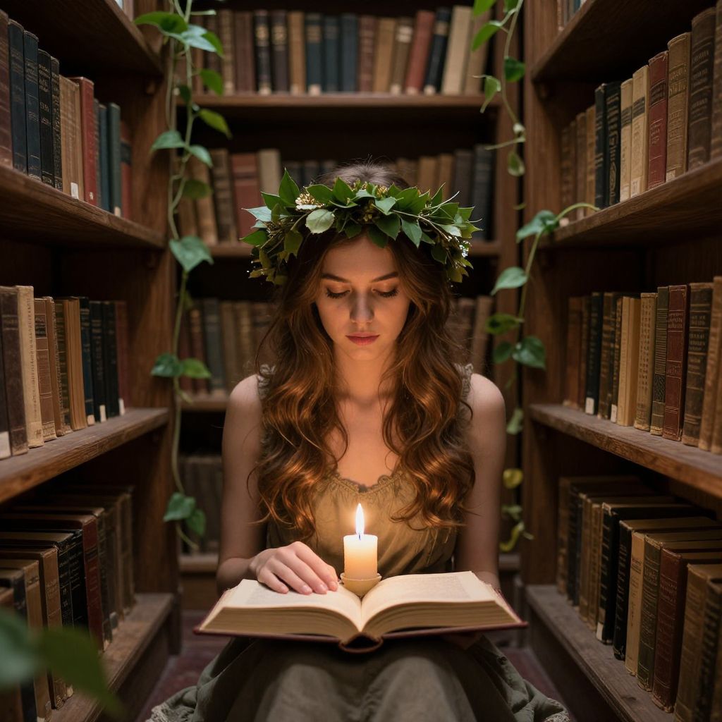 A young woman adorned with a green leaf crown sits amidst towering wooden bookshelves, her hands gently resting on an open book illuminated by a flickering candle, surrounded by lush vines that weave through the ancient library's atmosphere.