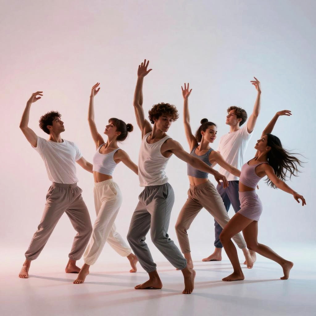 Stable diffusion pose prompts featuring a diverse group of dynamic human figures in various expressive dance and action stances, with soft pastel background gradients and intricate light diffusion effects, high detail, cinematic lighting.