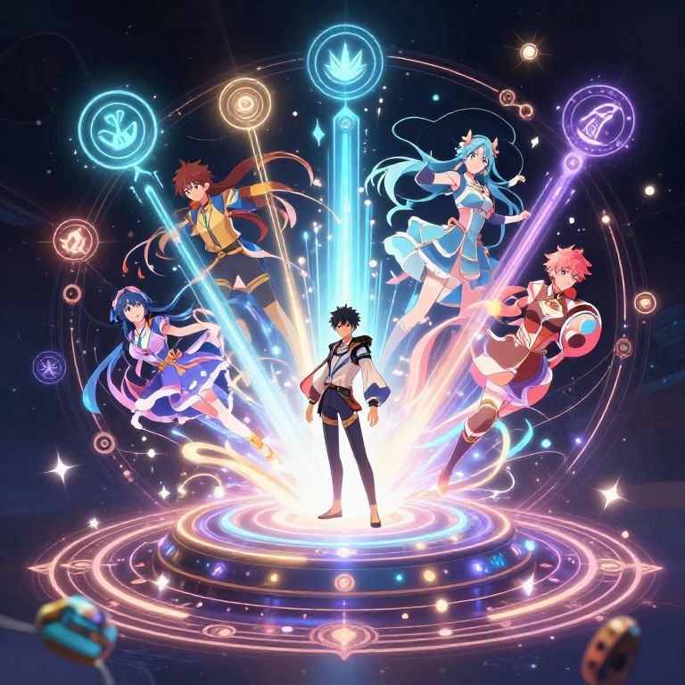 Fantasy-themed anime generator machine surrounded by magical symbols and glowing runes, ethereal light beams shaping anime heroes, intricate details with soft glowing colors, blending technology with fantasy art, dynamic anime style masterpiece