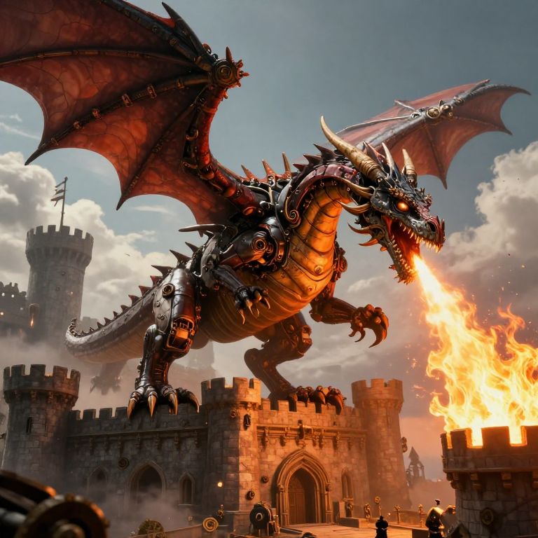 A mechanical dragon spitting fire to attack the castle, steampunk, ultra detailed, 4k, retro future, cloud in the sky, by greg rutkowski and jakub rozalski, artstation, concept art, artstation