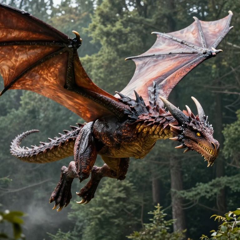 Realistic dragon flying high above a dense forest, intricate texture on leathery wings, fierce golden eyes glowing, sunlight reflecting off sharp claws, majestic and imposing, hyper-detailed fantasy creature soaring with wind currents.