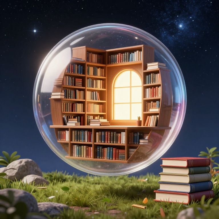 A digital CGI illustration depicts a transparent, spherical bubble encapsulating a wooden bookshelf filled with colorful books. The bookshelf features a large, illuminated arched window emitting a warm yellow glow. The sphere hovers above a grassy, rocky landscape under a starry night sky. In the foreground, a stack of books rests on the grass to the right. The texture of the sphere is smooth and reflective, contrasting with the wooden texture of the bookshelf and the soft, green grass below. The image blends fantasy and realism, creating a whimsical, dreamy atmosphere.