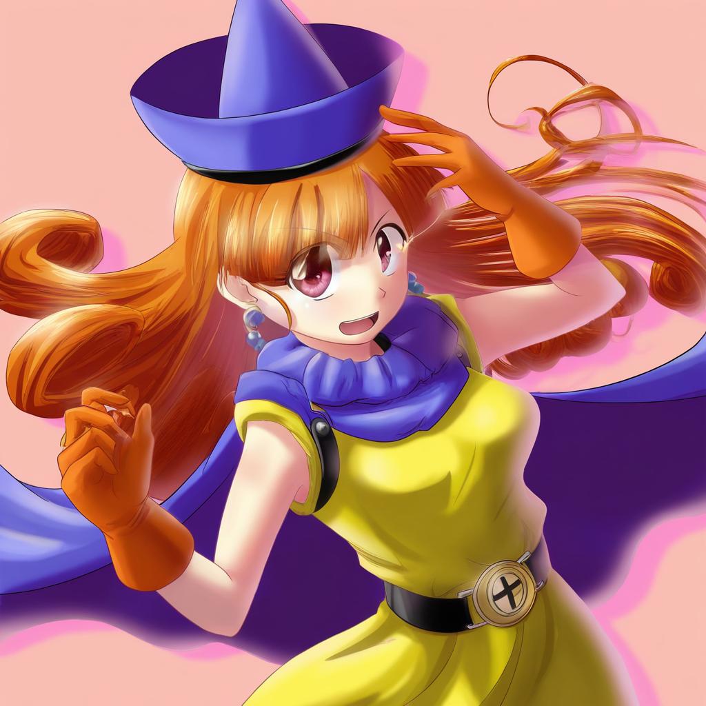 Digital illustration of an anime-style girl with long curly orange hair and red eyes. She is wearing a yellow dress with a high collar, a purple cape, orange gloves, a blue hat, and blue earrings. The character has a lively and dynamic pose with a light pink background.