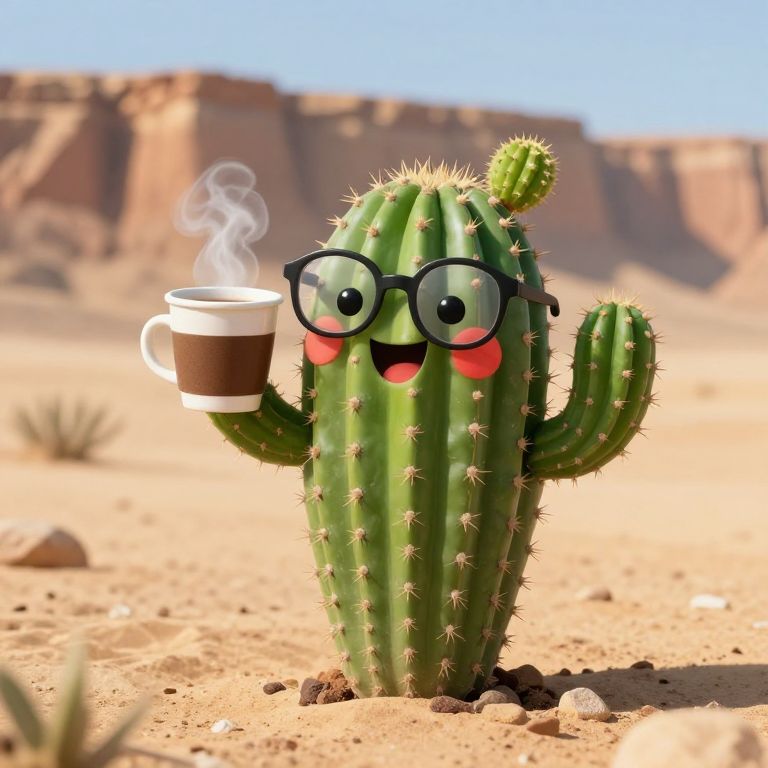 Digital artwork of a spiky, green cactus with red eyes walking in a bright desert under a clear blue sky. Sunlight casts sharp shadows.
