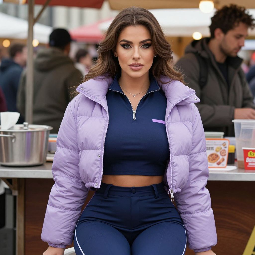 A woman, in a Richard Estes visual style, wearing a lilac cropped puffer jacket and navy blue boiler suit, sitting at a street food vendor at a cultural fair. Sexy. Pretty face and beаutiful eyes. Big breasts