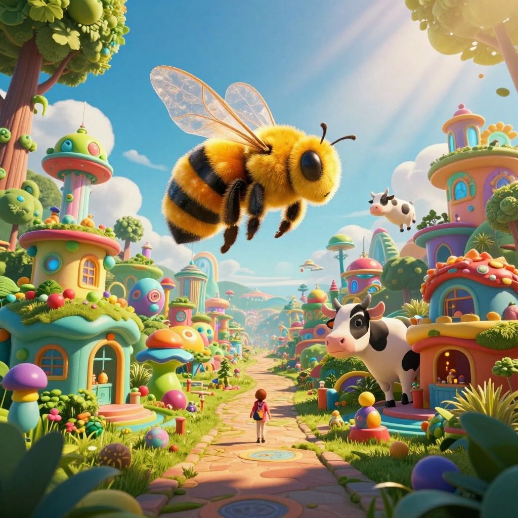 Central perspective of a smart village with psychedelic solarpunk architecture, big bee, flying cow, surrounded by lush nature - rays, ray - tracing, cinematic lighting, 8 k smooth, vibrant colors, ambient occlusion, hdr, complex, highly atmospheric lighting, highly detailed, alex grey, greg rutkowski, focus, cinematic, concept art, artstation, trending