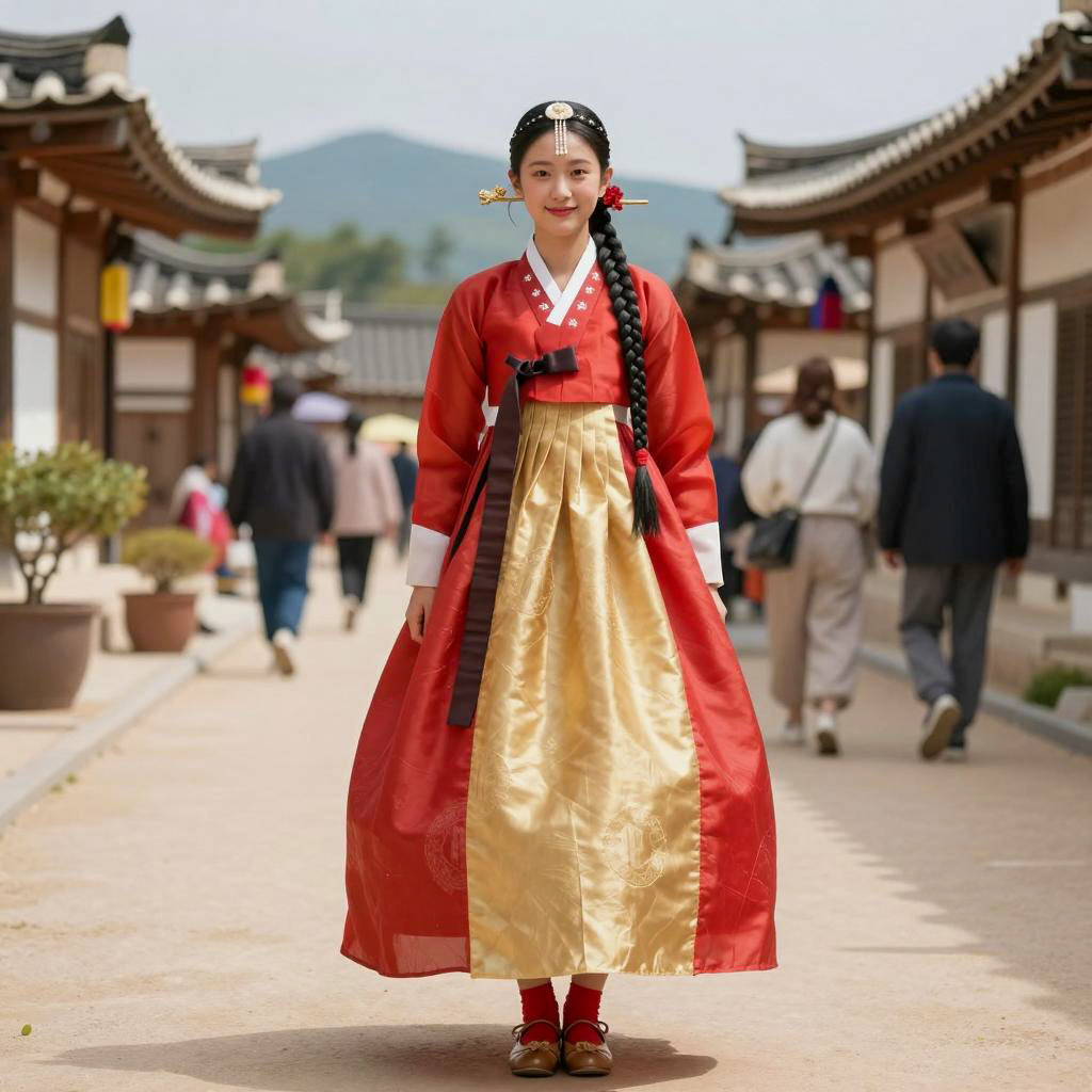 Appropriate woman costume, photorealistic, young woman, standing in traditional Asian street, daytime, clear sky, traditional Korean outfit, red and gold dress, red puffed sleeves, brown sash, black crossbow strap, long black braid with red flower, red socks, brown lace-up shoes, slightly smiling, casual pose, background blur, people walking, potted plants, traditional wooden buildings, mountain in distance, realistic lighting, detailed ures, vibrant colors, natural light, cultural attire, historical setting, street photography style