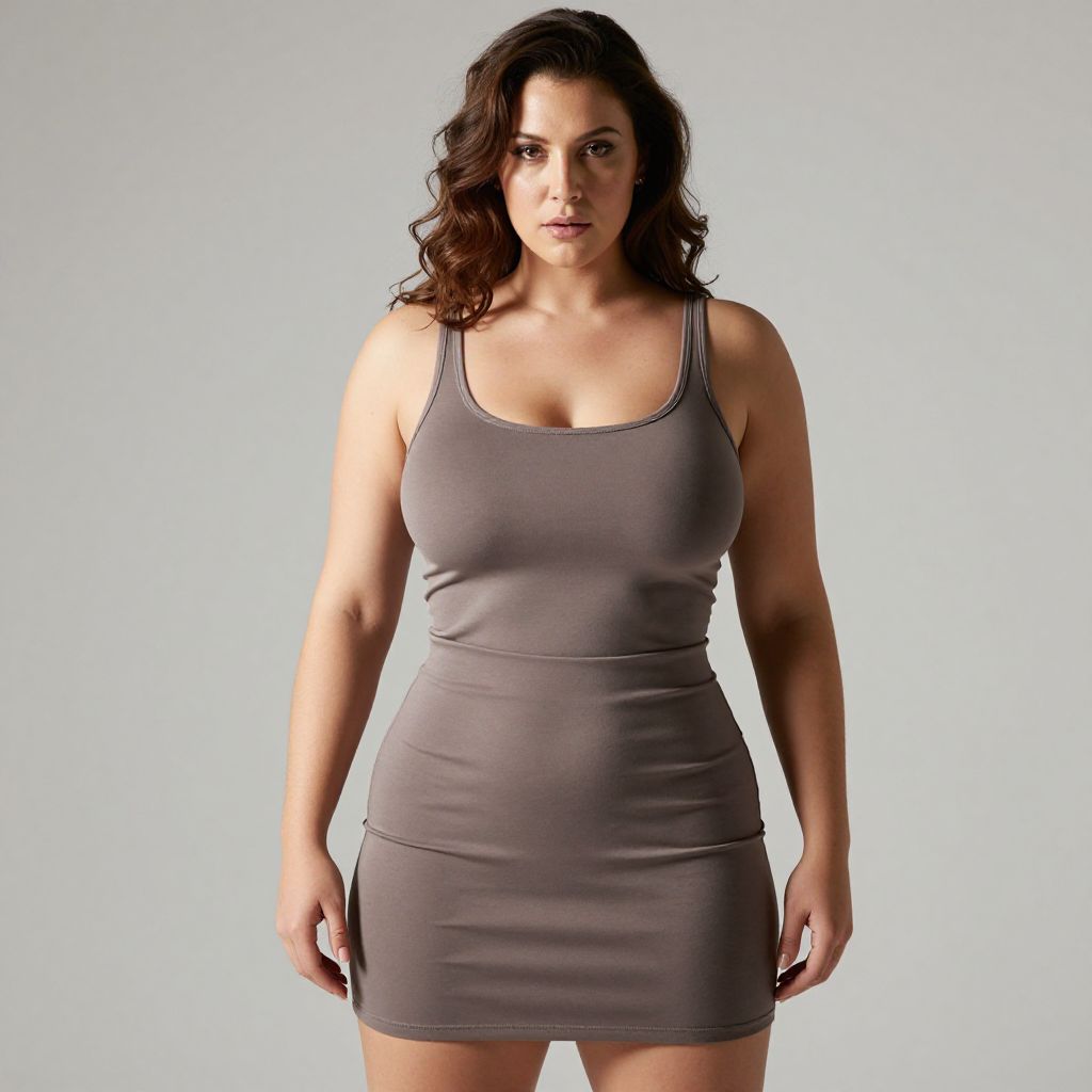 Photograph of a curvy woman with wavy, shoulder-length brown hair standing against a plain, light gray background. She's wearing a tight, taupe tank top that accentuates her large breasts and a matching, form-fitting mini skirt that highlights her hourglass figure. The lighting casts a dramatic shadow, emphasizing her toned arms and defined waist. She has a serious expression and is looking directly at the camera.