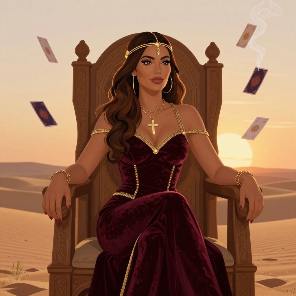 A digital illustration of a confident woman with long brown hair and olive skin, sitting on an ornate wooden throne in a desert at sunset. She's wearing a deep burgundy velvet dress with gold trim, a gold headpiece, and a cross necklace. Cards float around her, with smoke rising from one. Her expression is poised, with a slight smirk.