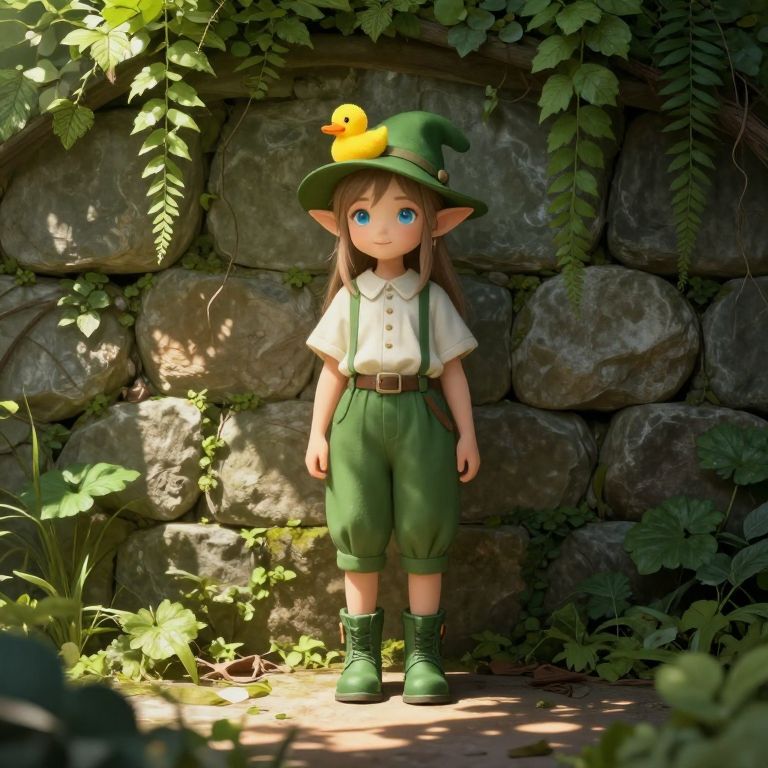 A young female elf girl stands in front of a weathered stone wall covered in lush green plants and hanging leaves. She wears a classic green hat adorned with a bright yellow duck, green pants, and sturdy green boots. Her delicate features are soft and ethereal, with glowing blue eyes and a gentle smile, giving off a sense of quiet wonder. The sunlight filters through the foliage, casting dappled shadows on the stone ground, creating a serene and magical atmosphere in a forested, enchanted setting.