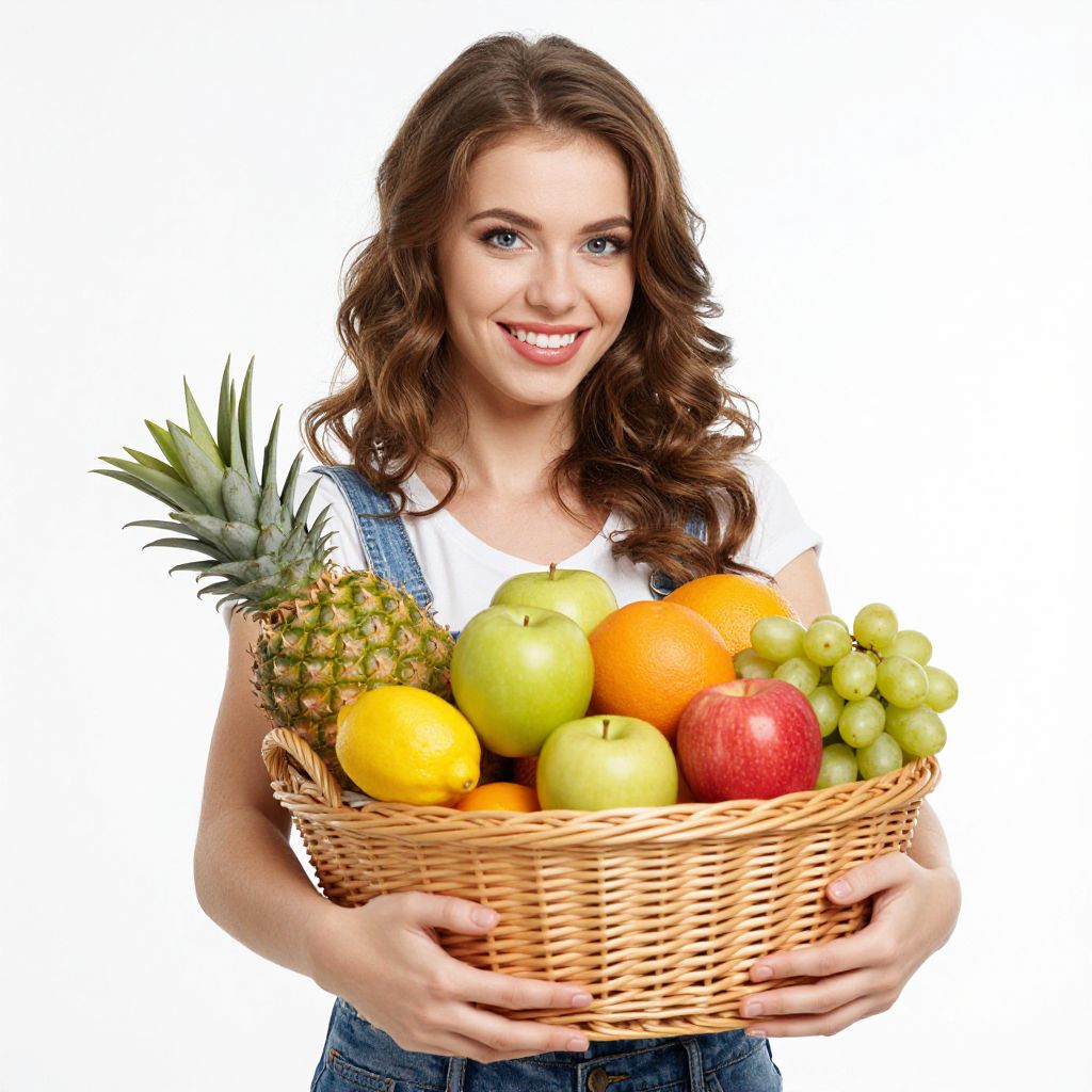Photograph of a smiling young woman with wavy brown hair, fair skin, and blue eyes, wearing a white shirt and blue denim overalls. She holds a wicker basket filled with a variety of fresh fruits: a pineapple, yellow lemon, green apple, red apple, orange, red grapefruit, and green grapes. The background is pure white, making the colorful fruits and her bright smile stand out prominently. Her hands are gently cradling the basket at the bottom, and she gazes directly at the camera.