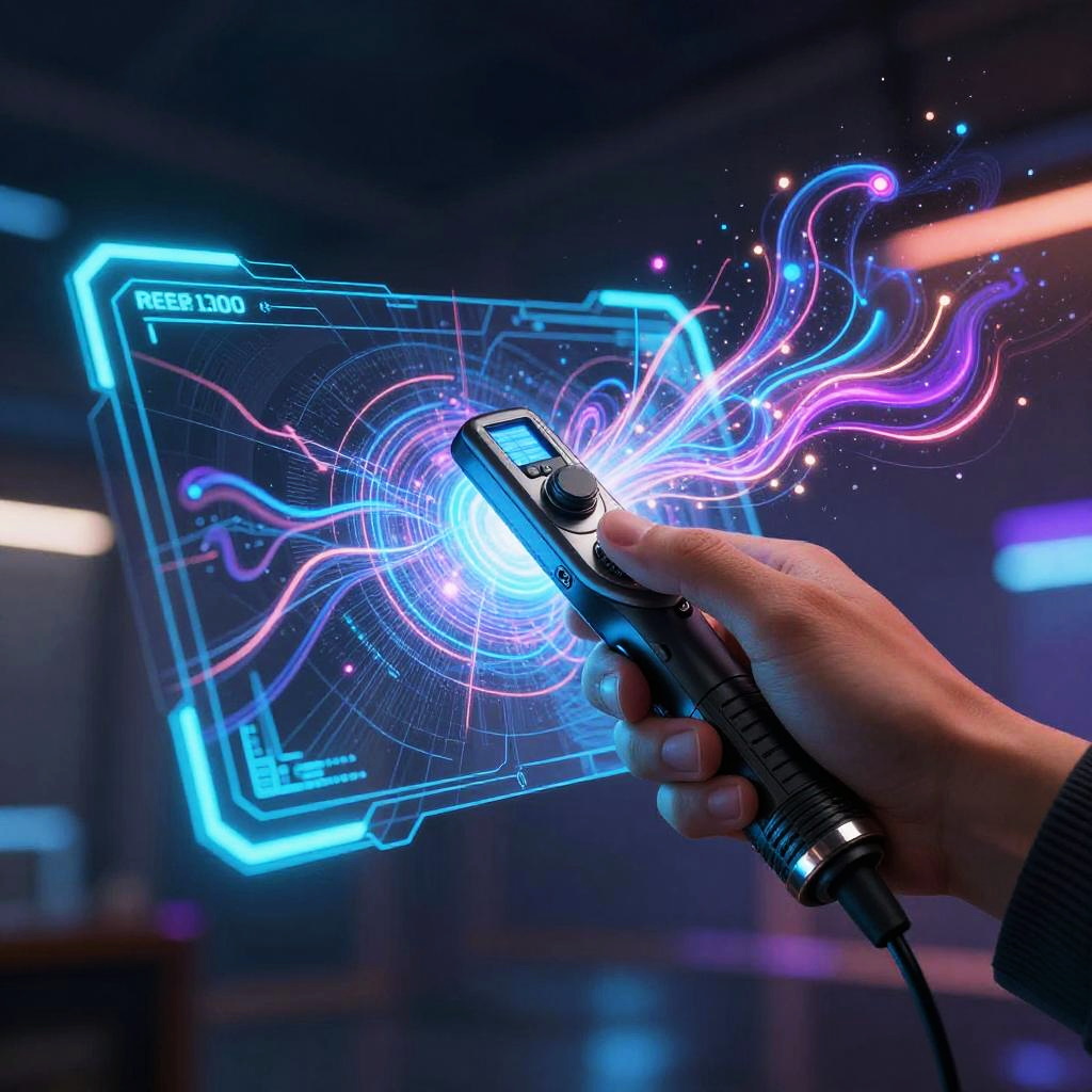 Photograph of a hand holding a black, rectangular device with a glowing blue screen, emitting vibrant, swirling neon blue and purple light trails. The device displays a digital interface with grid lines and the text "RECORDING" in the top left corner. The background is a dark, blurred room with faint, colorful lights. The hand is light-skinned, and the device has a textured, ribbed surface. The scene has a futuristic, high-tech aesthetic.