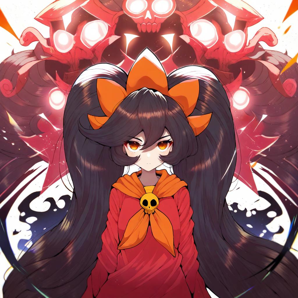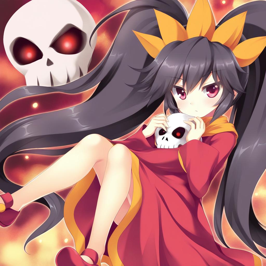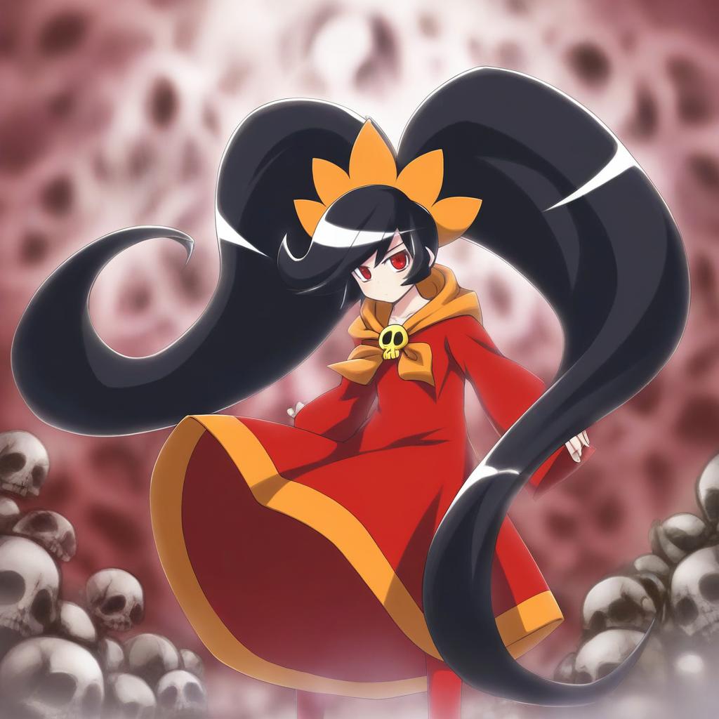 Ashley (warioware), warioware, 1girl, red eyes, black hair, long hair, very long hair, big hair, orange hairband, twintails, red dress, tiara, skull, by artist tateha (marvelous grace), leet