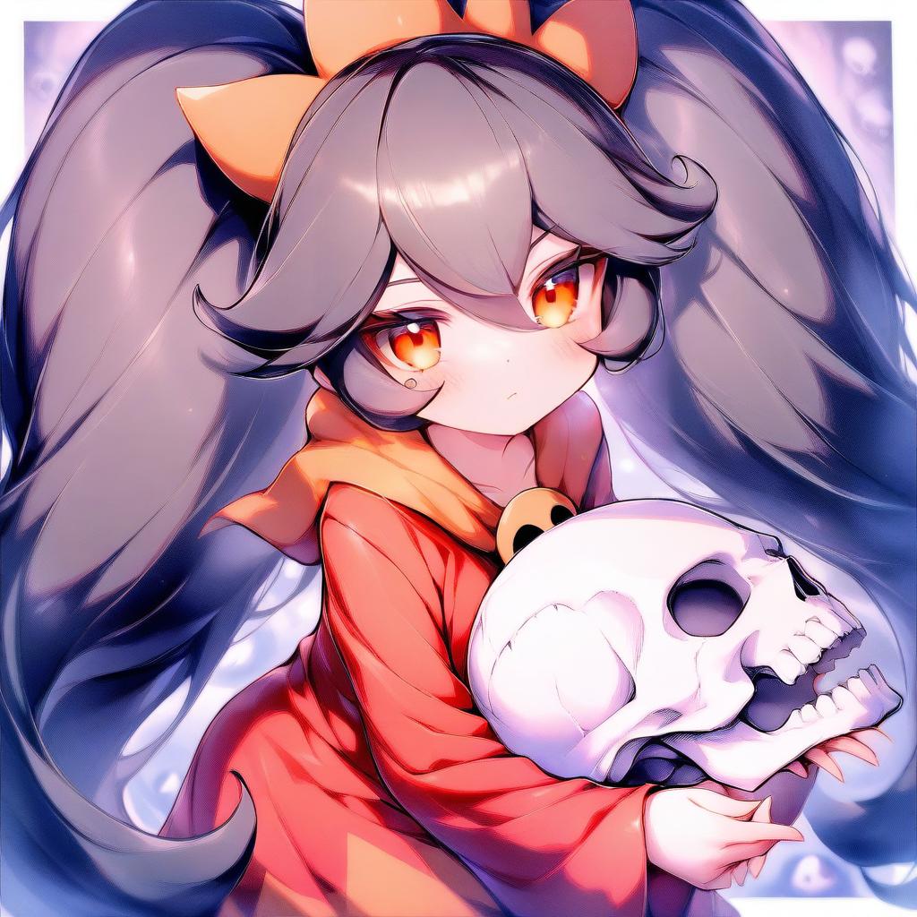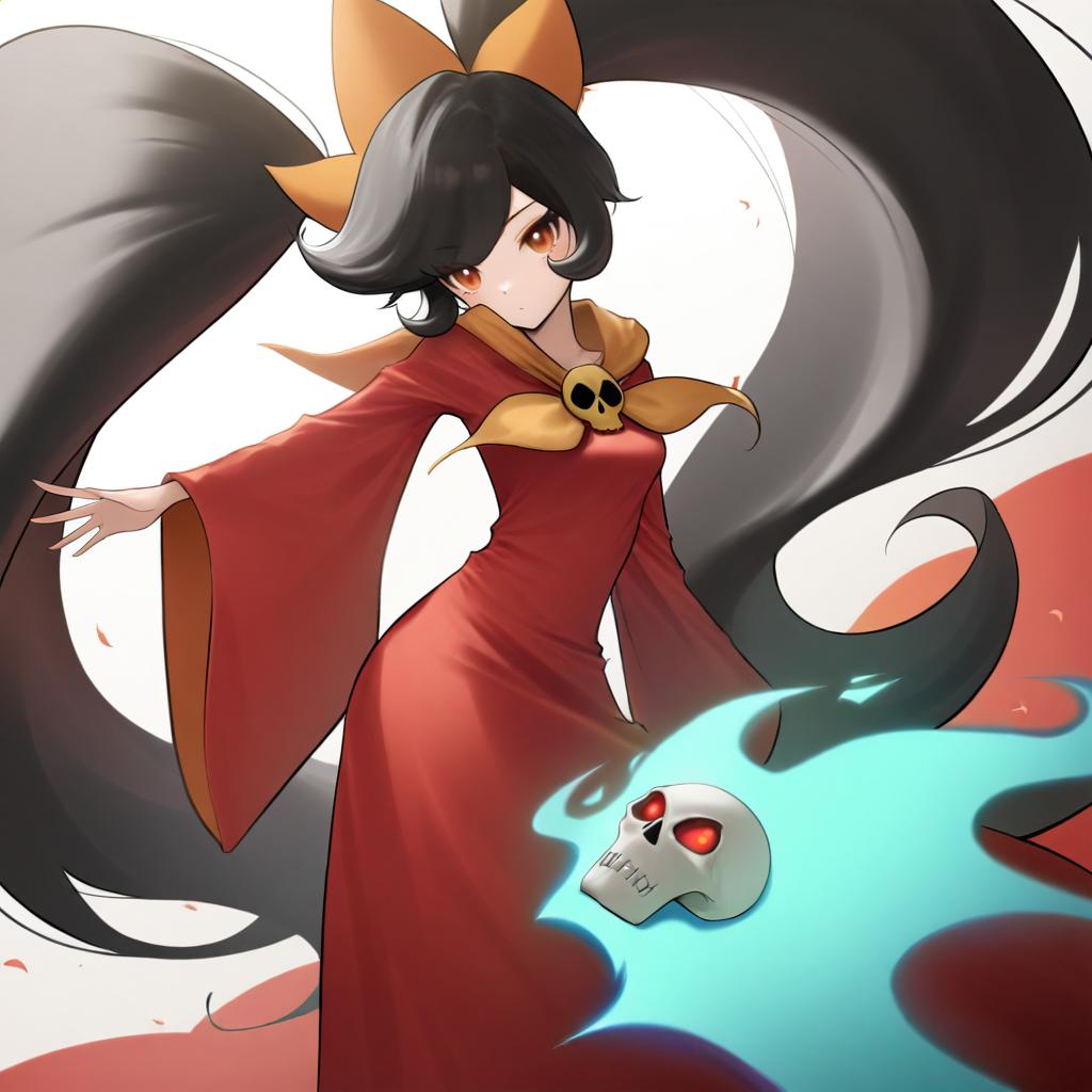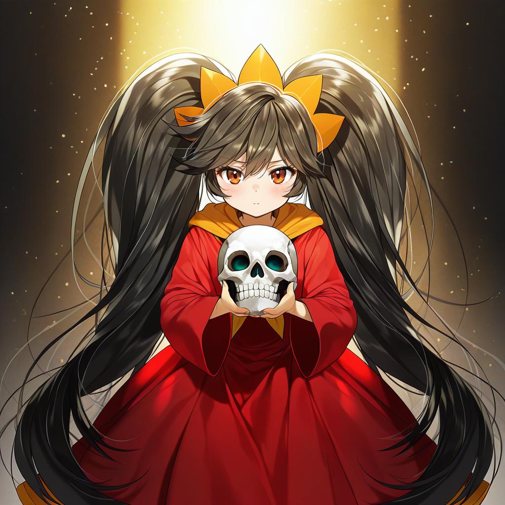 Ashley (warioware), warioware, 1girl, red eyes, black hair, long hair, very long hair, big hair, orange hairband, twintails, red dress, tiara, skull, by artist tateha (marvelous grace), leet
