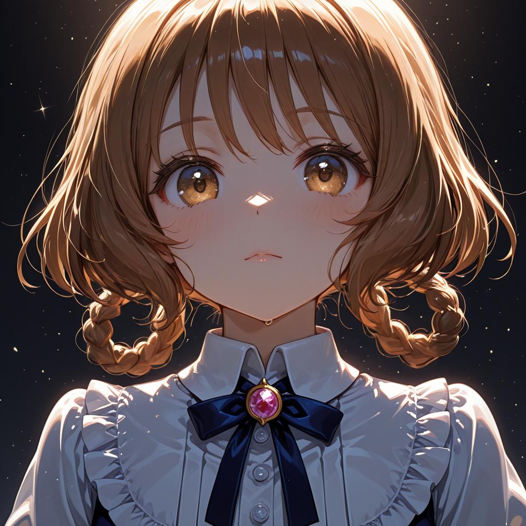 Hanamichi ran, delicious party precure, 1girl, red eyes, brown hair, blonde hair, short hair, medium hair, hair rings, magical girl, by artist ran'ou (tamago no kimi), dark_illustrious